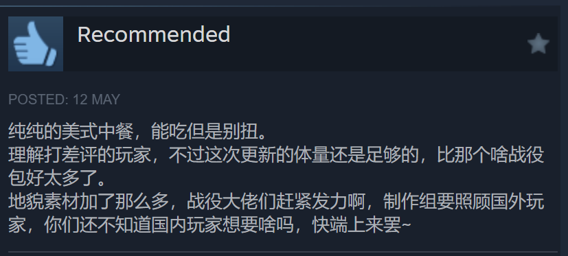 Translation: Feels like American Chinese food, edible but feels odd (). I understand players who gave downvotes. However, there is a lot of content in this update (DLC), much better than that campaign DLC (we all know which one).
