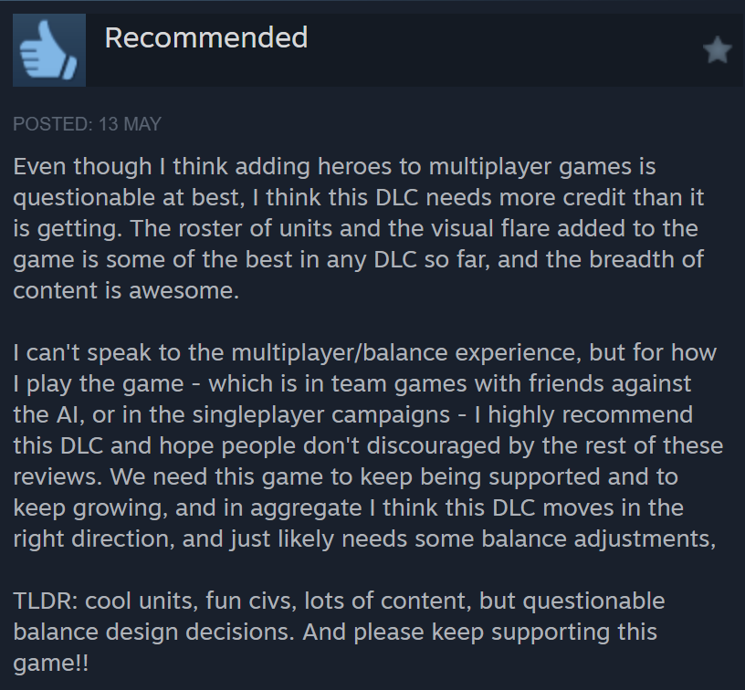 I just want to update you that while the DLC skews positive, the overall reviews for the base game have skewed overwhelmingly positive since the release, so I mean, doesn’t seem like widespread backlash to me. Seems pretty limited.