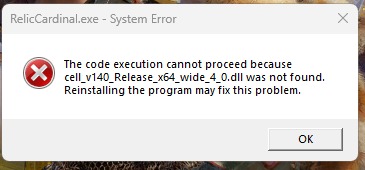 When I try to run the game, I get the following error: The file cell_v140_Release_x64_wide_4_0.dll is missing.
