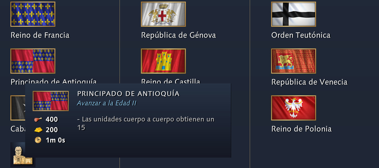 Principado de Antioquía: Las unidades de combate cuerpo a cuerpo obtienen un 15 % más de daño.