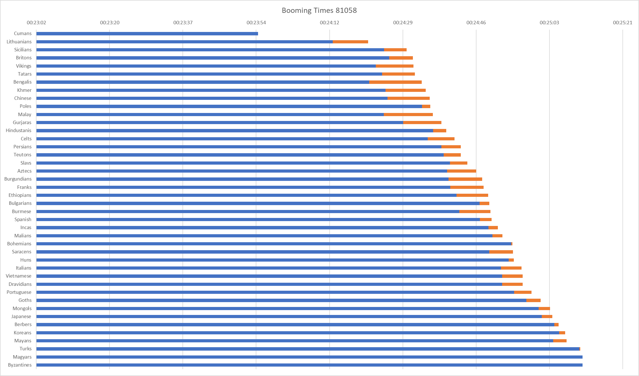Its not me, your post is about the potential for a civ to get to a fully boomed state which you yourself mentioned as approximately 120-130 vills. Obviously its not the “only” thing that counts but its one of the most important factors for a boom comparison. When you’re measuring the time needed for each civ to hit a certain state which you mention as roughly translatable to 120-130 vills in a no-military situation, why wouldn’t it be the most important criteria?