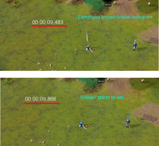 The two images below is showing how i calculated 400 ms as the delay. The first picture is showing the first frame of the visual indicator for the command. The second one is when the villager is starting to act, as you can see he changed from an axe to a herdeling(?) stick.
