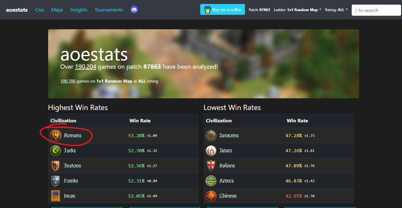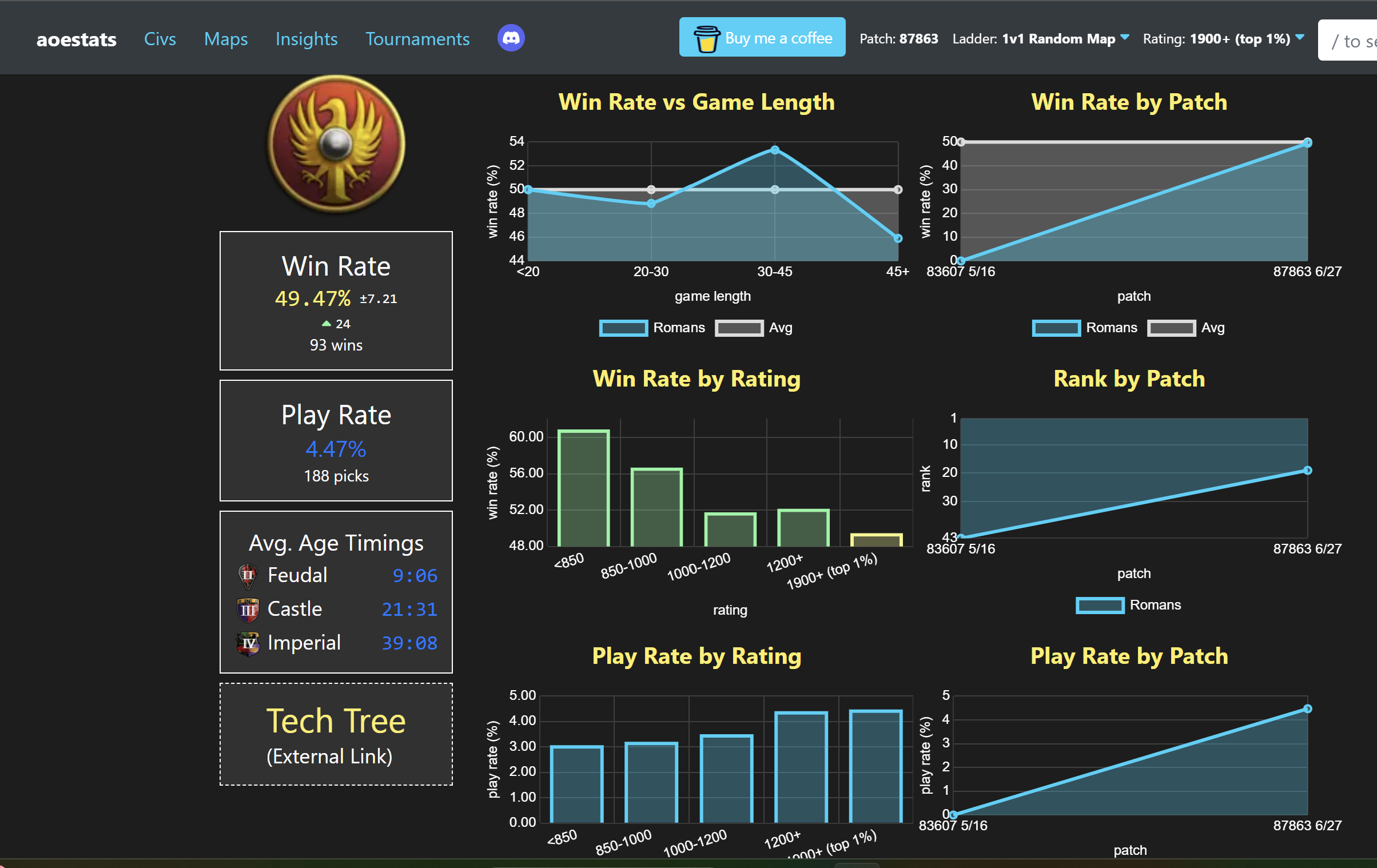 The reason why Romans have a negative winrat is mostly due to the little dip in the midgame not the lategame. And that’s also representing the timespan I spoke about where I know Infantry isn’t viable. Even Romans can’t make it work to reliable success.