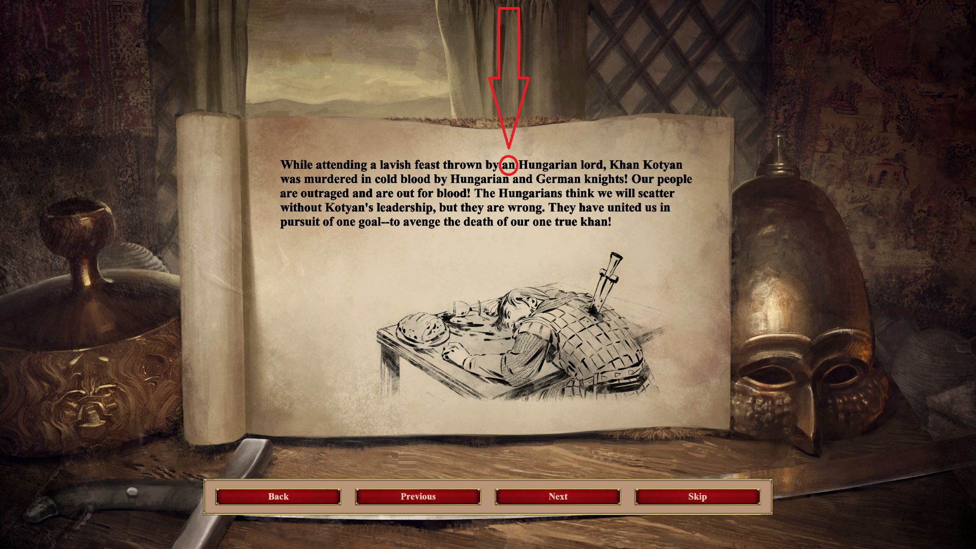 The intro of the scenario begins as follows: ‘Treachery! While attending a lavish feast thrown by an Hungarian lord, Khan Kotyan was murdered in cold blood by Hungarian and German knights!’. There is a grammatical error: it should be ‘a Hungarian lord’ rather than ‘an Hungarian lord’. (The voice narration is correct, though.)