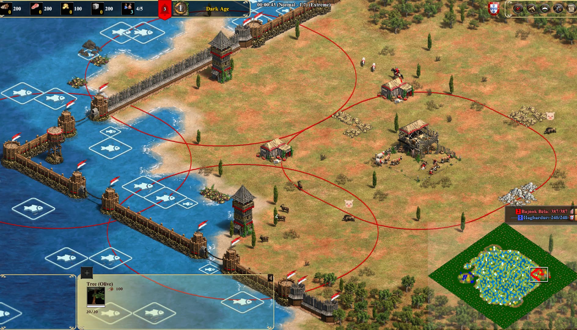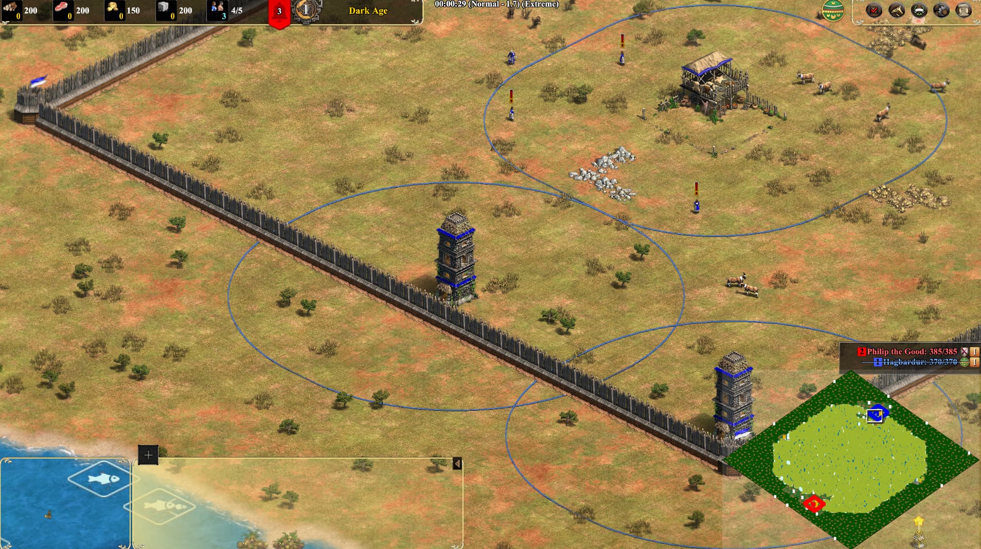 - Huge size map, no walls, no sea towers for 1 player, base too far from water, other gets sea towers and walls, 2nd generation shows sea towers and walls for both,