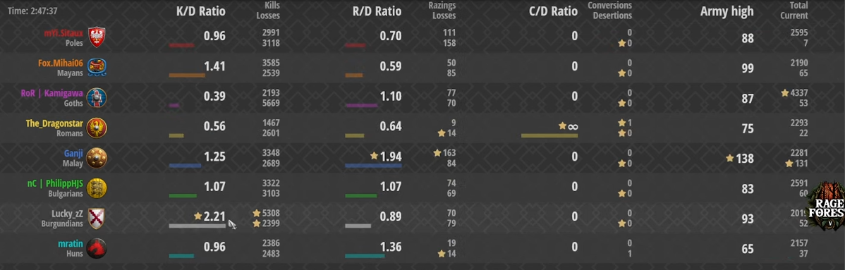 A game with 24600 kills and one conversion. Siege onagers featured heavily on the cool-color team with Bulgarians. I checked the tech trees for monks: Poles have all the important techs except Illumination; Mayans and Goths lack Redemption; Romans have Redemption and Block Printing, but lack Theocracy (only one monk in a group rests) and Sanctity. But if using monks were easy, there were still plenty of paladins from the Huns player that could have been converted.