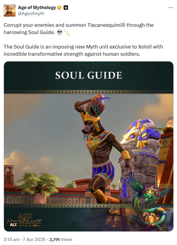 The all-new 12-mission campaign tells an epic story of divine conflict and survival. When the eternal rivalry between Quetzalcoatl and Tezcatlipoca destroys the utopian city of Aztlan, Huitzilopochtli seizes the moment to lead his people south in search of a new empire. Meanwhile, Tezcatlipoca escapes through his Obsidian Mirror, crossing continents to recruit legendary allies and reclaim his dominance.