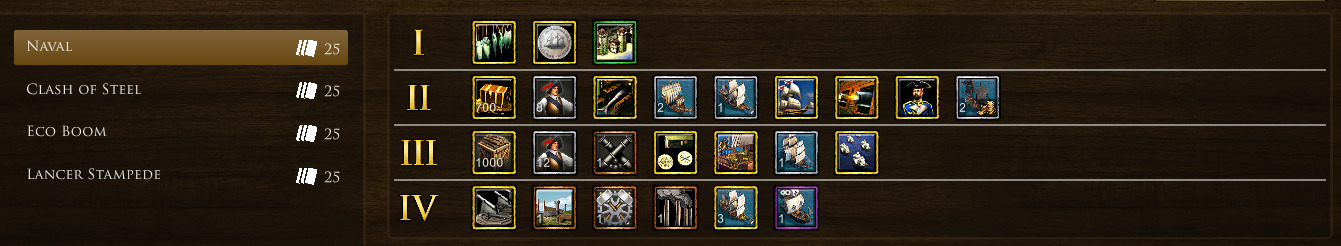 As you can see, only naval does not have 3 Vills and 5 Vills, and only Infantry deck does not have 3 Vills and 700 Gold.
