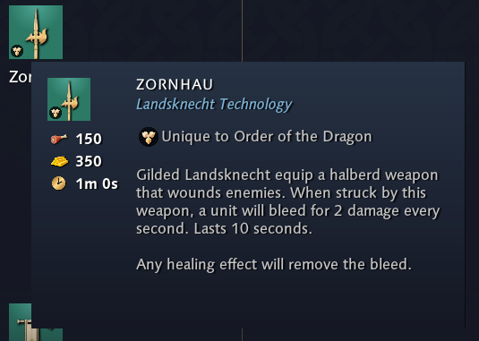 For Order of the Dragon, the “Zornhau” upgrade from the “Meinwork Palace” Landmark gives a bleed damage-over-time effect to the Gilded Landsknecht.