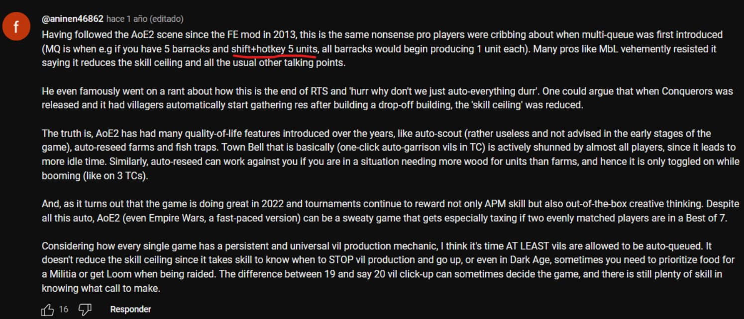 It is that, knowing the average RTS players (and several very conservative on this subject), I do not even want automation to benefit players of medium or high levels (hence the idea of the time penalty), because then someone from the AoE2 section comes to me commenting things with little sense when I have already clearly said that production automation would not be for someone who is in Platinum+ or for someone who is at 1200+ Elo in games like AoE2.