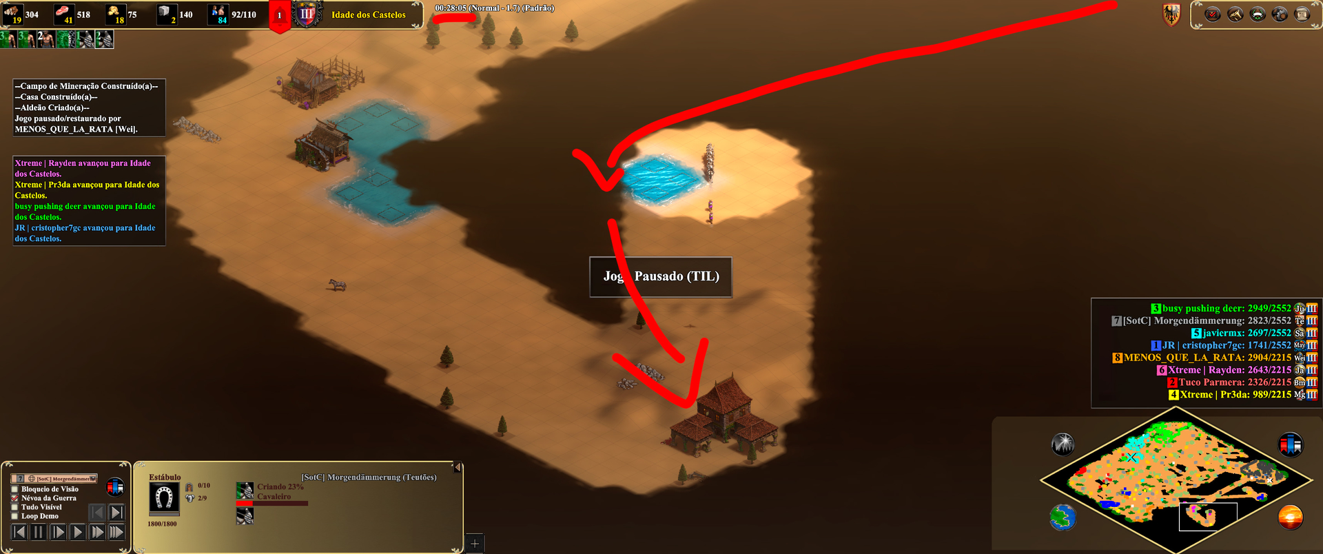 On my second attempt to build a castle, the same thing happened. He anticipated my move, attacked the foundation before construction started, and I lost my stone again. You can see in the screenshot that he comes down with a cavalry unit directly to my castle to destroy it, even hitting it from inside the construction area.