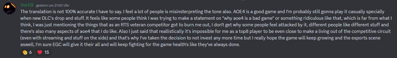 I mean, VortiX is known to be frustrated at certain aspects of AoE 4, especially walls being too strong that discourages aggresive play. He’s also known for switching games as Beasty mentioned in a reaction.