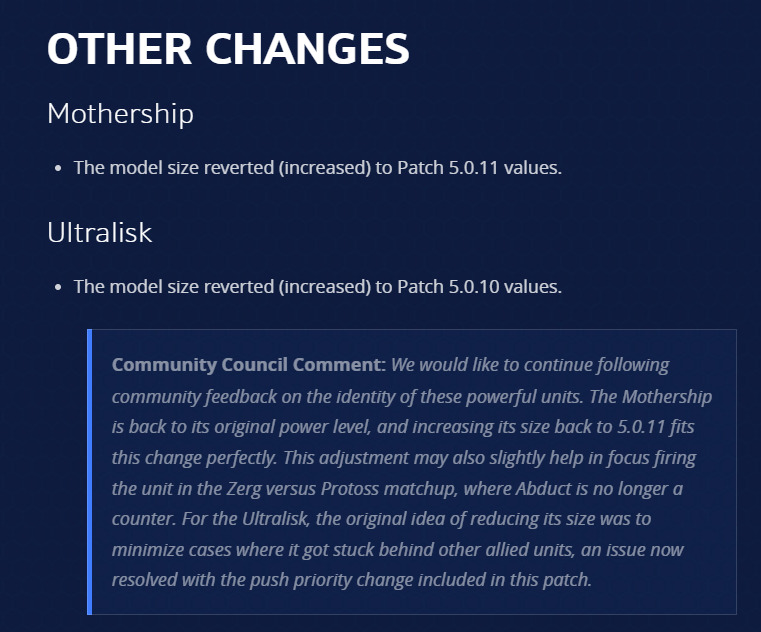 Community Council Comment: We would like to continue following community feedback on the identity of these powerful units. The Mothership is back to its original power level, and increasing its size back to 5.0.11 fits this change perfectly. This adjustment may also slightly help in focus firing the unit in the Zerg versus Protoss matchup, where Abduct is no longer a counter. For the Ultralisk, the original idea of reducing its size was to minimize cases where it got stuck behind other allied units, an issue now resolved with the push priority change included in this patch.