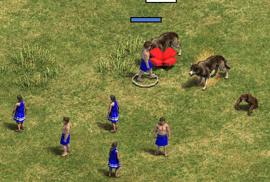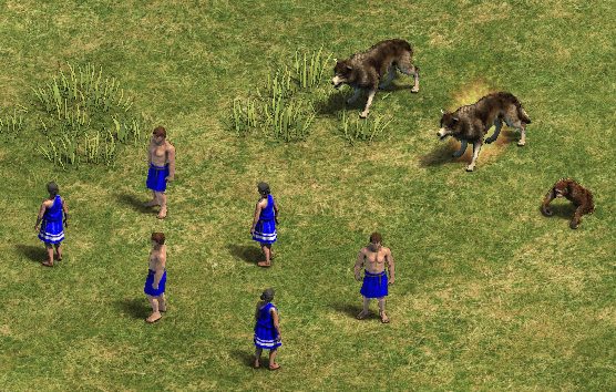Villagers vs. Gaia units Rabid Wolf, Ornlu the Wolf, and Furious the Monkey Boy.