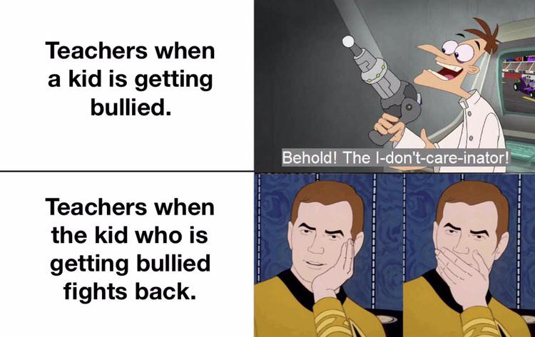 Now why do you think the high school teacher doesn’t care when the kid is getting bullied? think about that and you will have your answer to your questions.