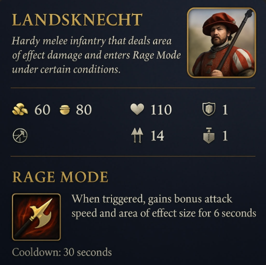 - Doppelsöldner: Heavily armored, 175 hp, 4/4 armor, 1.19 speed → weaker than a basic MAA, but 5% faster // Damage: Around 40%~50% less than the old Landsknecht, but still deals AoE dmg. Maybe they get an alternative mode to switch to a Katzbalger, so they’d become single target with slightly less power than a basic MAA → Don’t know if necessary, but it’d give them a nice extra touch in a historcially accurate fashion. Attackspeed: 1.375 . Costs: 70 food and 80 gold.