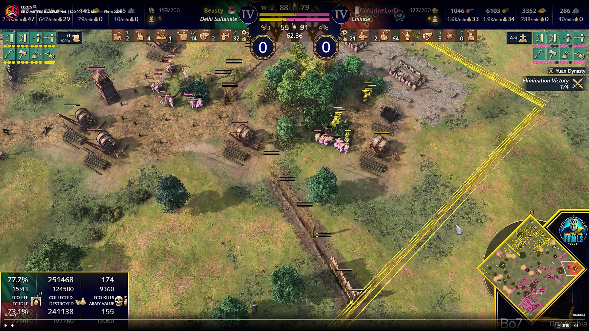 From this screenshot, we can see that at 62:36 in the game, Beasty (playing as the Delhi Sultanate) has nowhere left to chop wood. Wood has become a finite resource as scarce as stone! This means that at this stage, Archers have effectively become more expensive than Handcannoneers!