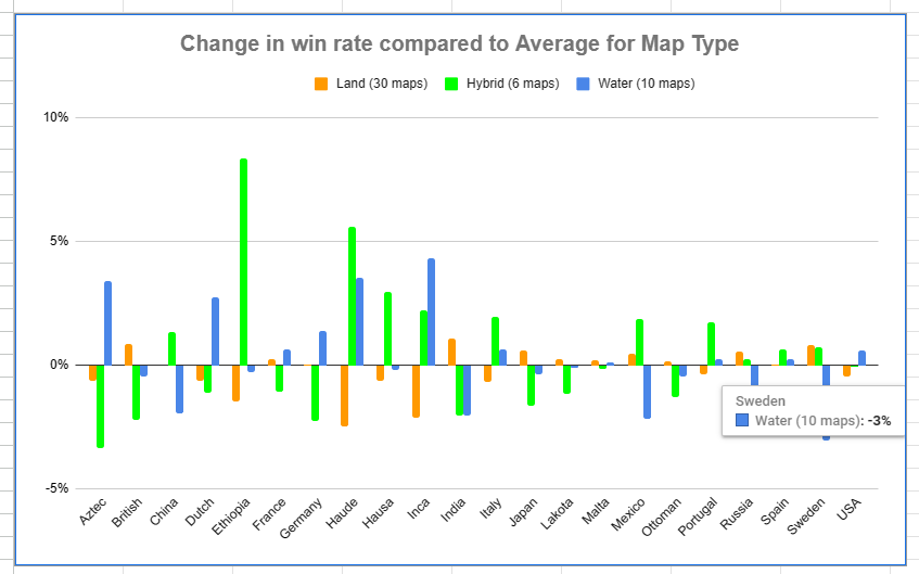 In this graph above we can see that Sweden has a decrease of 3% in its win rate in water maps.