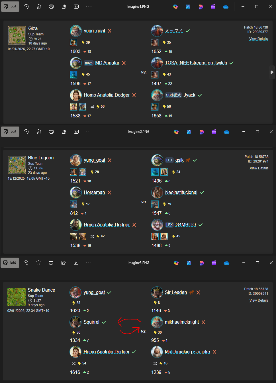 Image3 included. The likelihood that Anatolia_dodger and I were the only ones pre-made is 99% according to my investigation. Squirrel (Susano) and Mikhael (Poseidon) should have swapped positions in the teams to make the game more balanced.