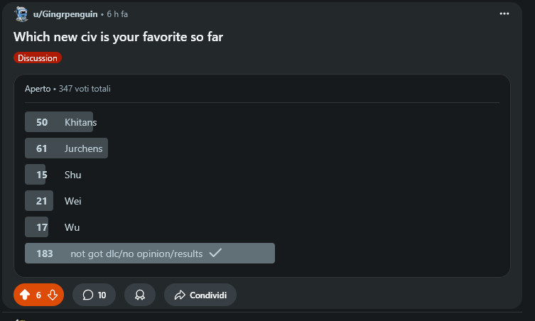 But directionally this is really hard to ignore. Even if you throw out all the “not good dlc” votes as haters, the fact the 3k civs collectively have as many votes as the second place khitans really says volumes.