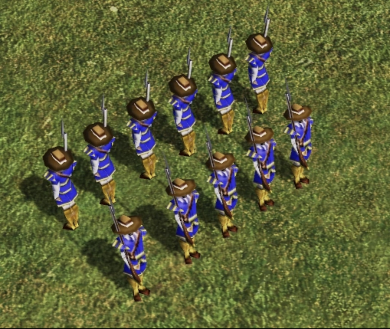 The Soldado replaces the Musketeer and is unique to the Mexicans. It is available starting in the Commerce Age and, like the Musketeer, is effective against cavalry and shock infantry but weak against light infantry. Soldados are stronger and have a fast bayonet attack, but slower to train and take up two population slots rather than just one.