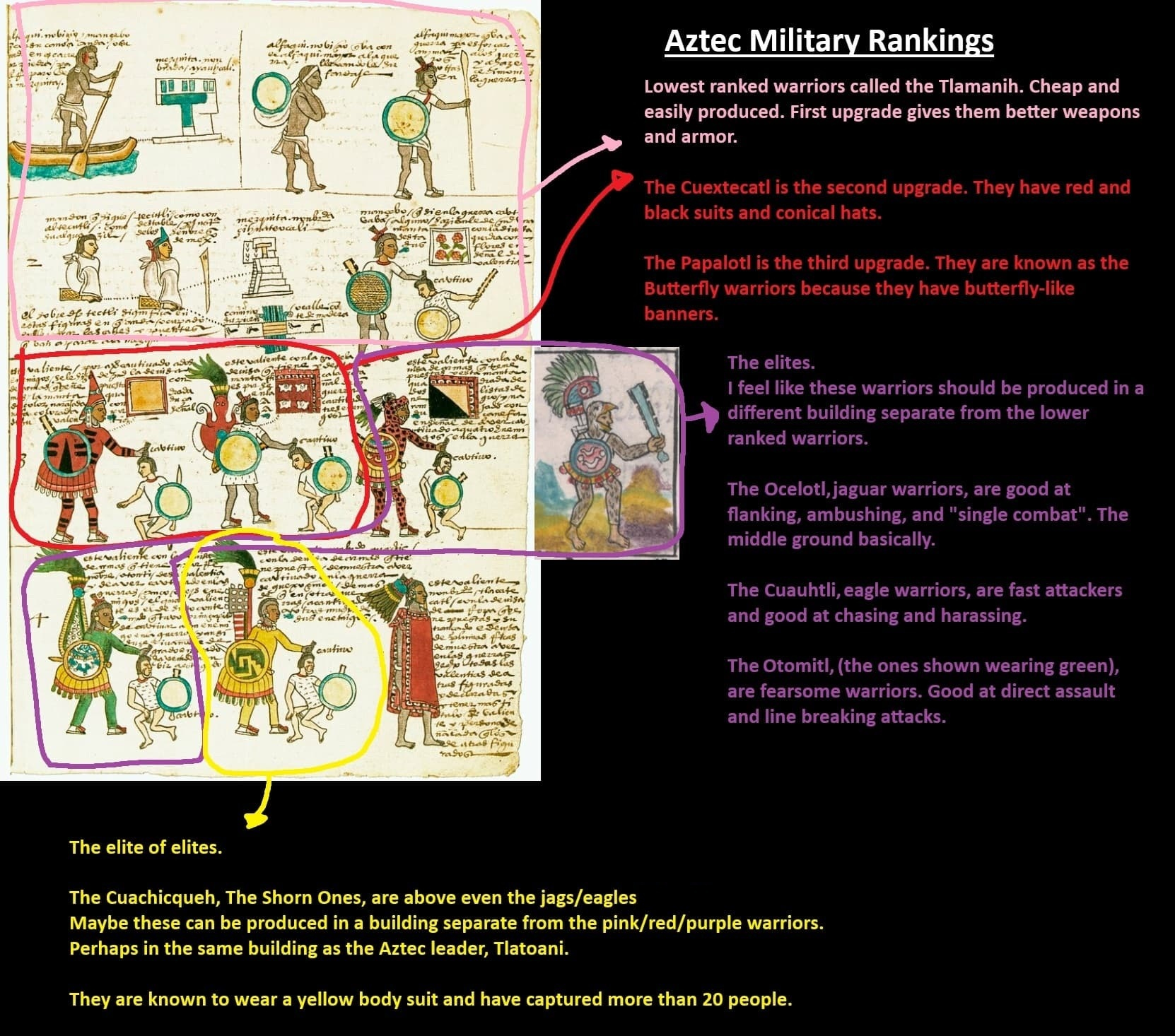The Aztec system includes many different roles. Should a low ranked warrior progress through the ranks and eventually reach Jaguar, Eagle, Otomitl, or Shorn status through upgrades from buildings or armory improvements? And how should these branches be separated so the choices feel clear and not overwhelming?