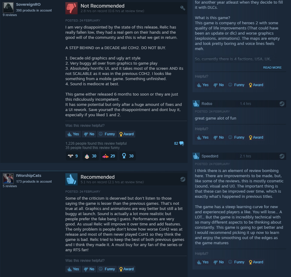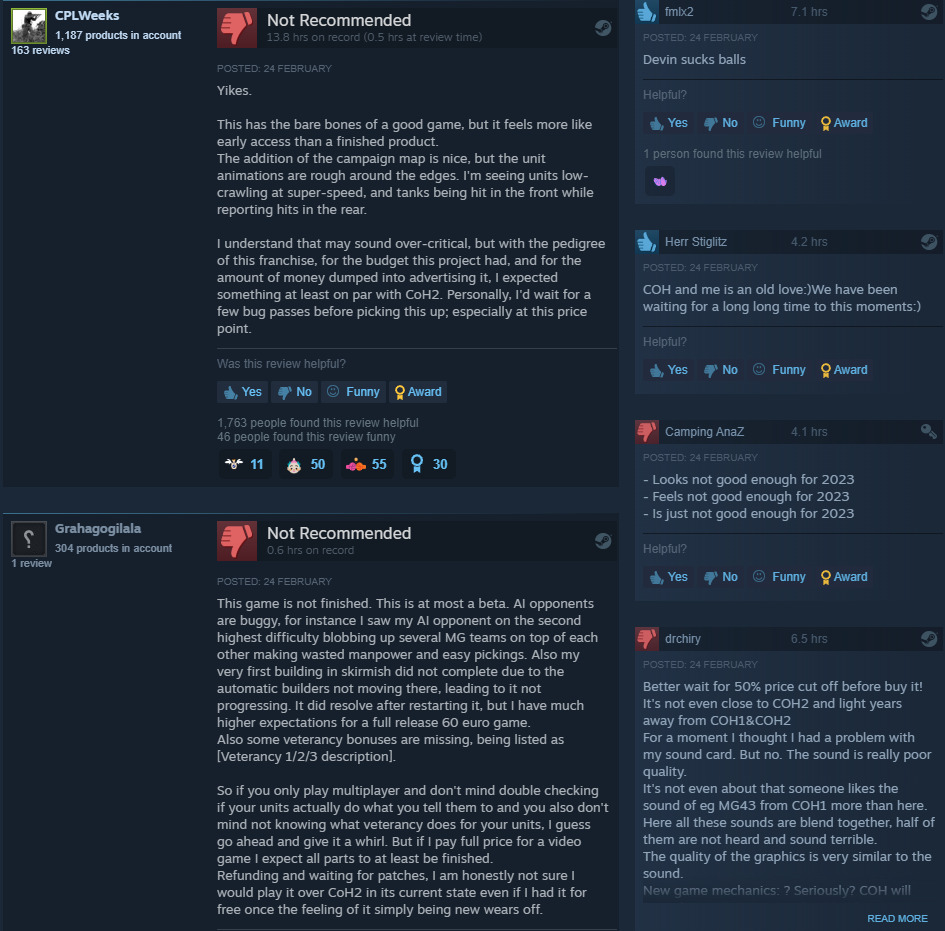 Same. I have been closely watching reviews of CoH 3 and it’s very interesting to see the same pattern showing up. Regression or not enough of an improvement in graphics compared to the last game? Check. Weird animations and visual glitches? Check. Feeling of the game being released incomplete? Check. Extreme fps hits when panning? Check.