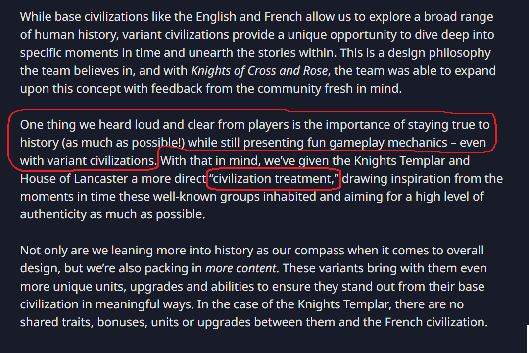- The new variants of Knights of Rose and Cross vary quite a bit from their parent civs, except for the historical concepts they should have in common, such as language or architectural model (S10)