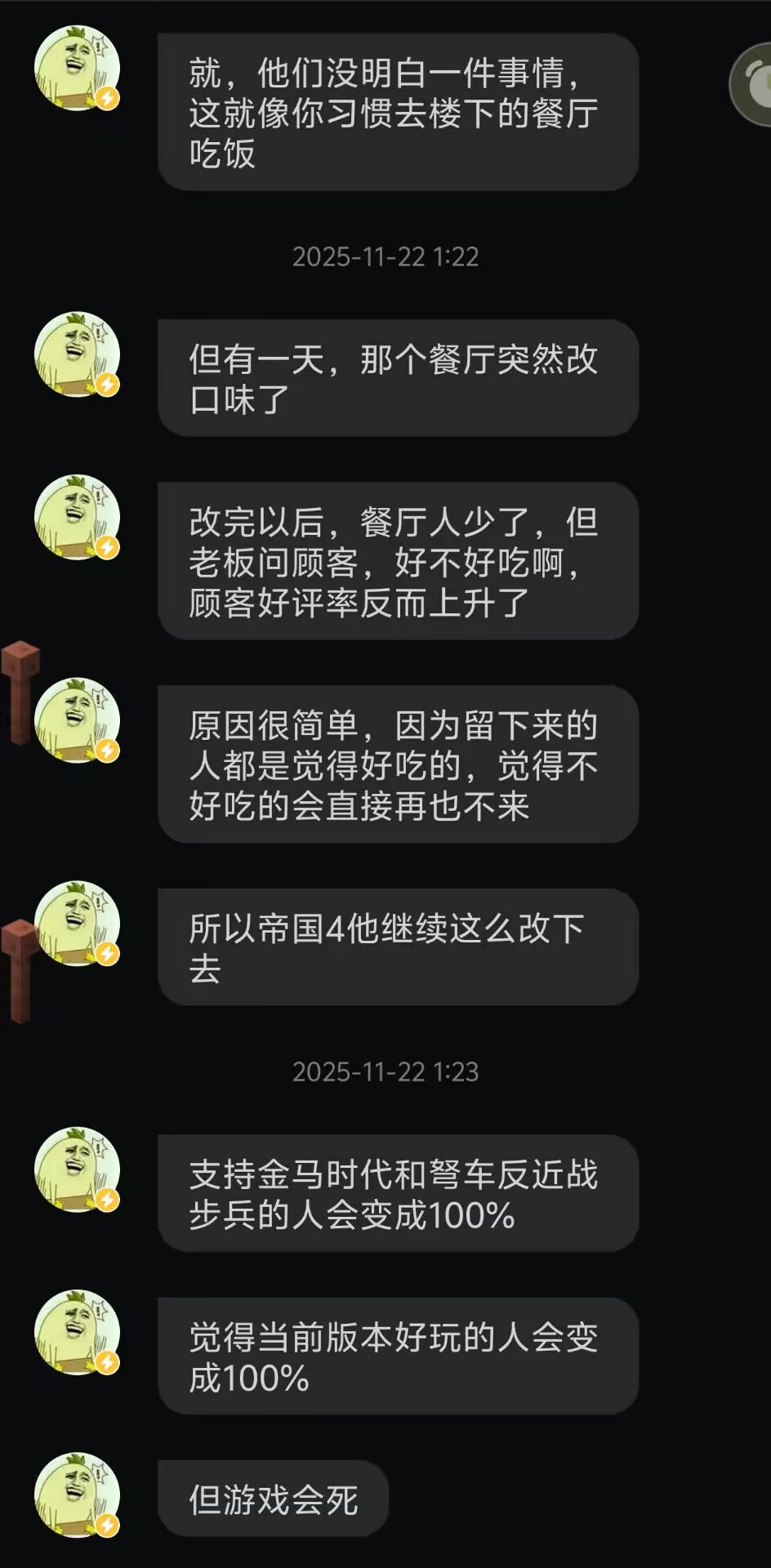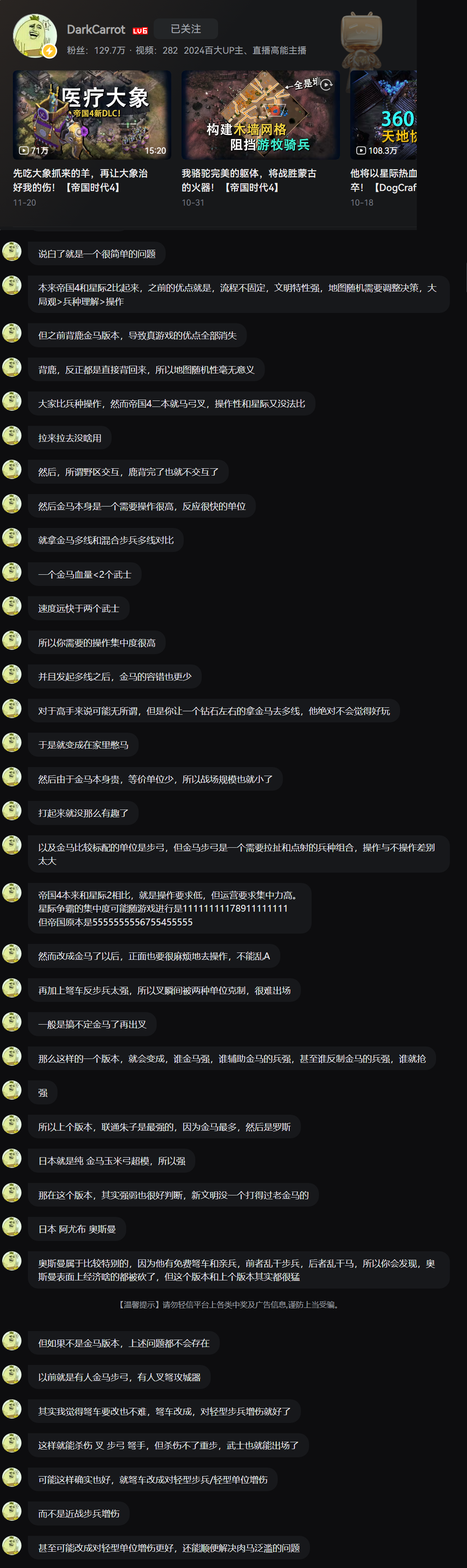 To provide further evidence from a respected community figure, yesterday I also consulted DarkCarrot, a prominent Chinese AoE4 streamer with 1.297 million followers. He firmly believes the current version is “deformed.”He pointed out that viewership has declined since last year’s major update, an update that saw changes like springalds no longer effectively countering siege weapons and the rise of an overwhelmingly Knight-centric meta.He elaborated that the game’s original strengths were its non-linear gameplay, distinct civilization identities, and the need to adapt decisions to random maps, where overall strategy > unit knowledge > micro-management. However, in this “Age of Knights,” all these advantages have vanished.He noted that in the previous version, the pro scouts made map randomness meaningless, as games would revolve around “the scout carried the deer back,” reducing map interaction. Now, in the current version, the core problem still remains a contest of whose Knights are stronger.He expressed deep concern for the game’s future, even stating that he believes without last year’s changes, the game’s daily active users could have reached 60,000. Conversely, he fears that if changes continue in this direction, the player base will only continue to shrink.