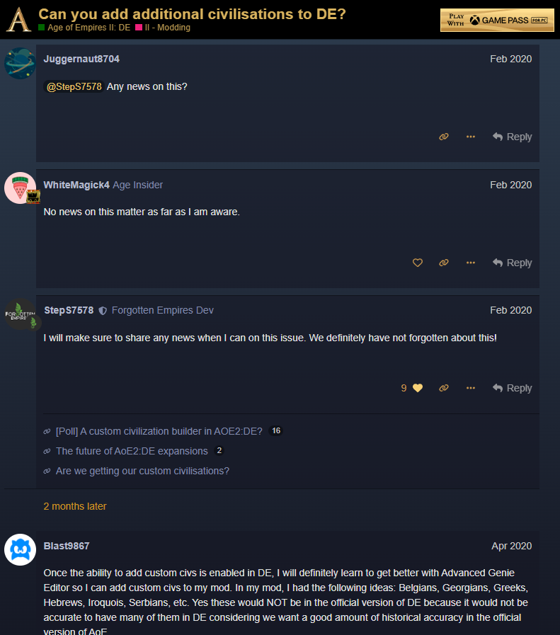 Similarly, devs initially promised that they will allow adding new civs without replacing existing ones.