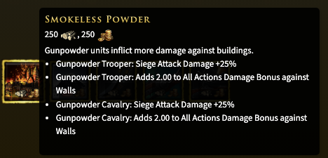 It’s a very weird upgrade. It names “smokeless powder”, which is a name for a different upgrade. And it’s icon is that of the “Magdeburg Wedding” upgrade from the command post in historical battles. But the description is something completely new: +25% Siege Damage and +2 Multiplier Bonus against Walls. When selecting this upgrade, the stats in the UI update accordingly, it shows a x3 (1 + 2) multiplier against walls.