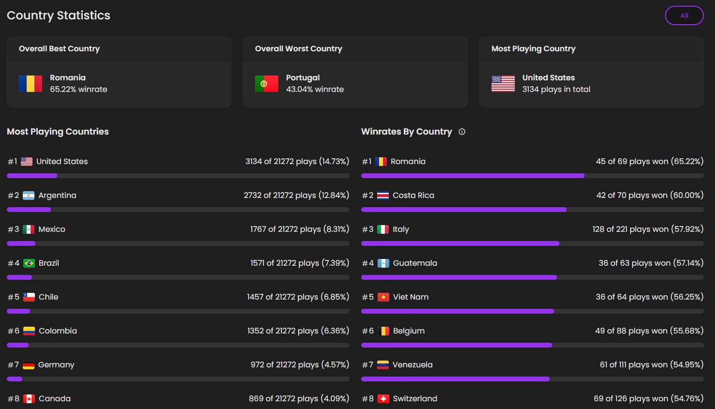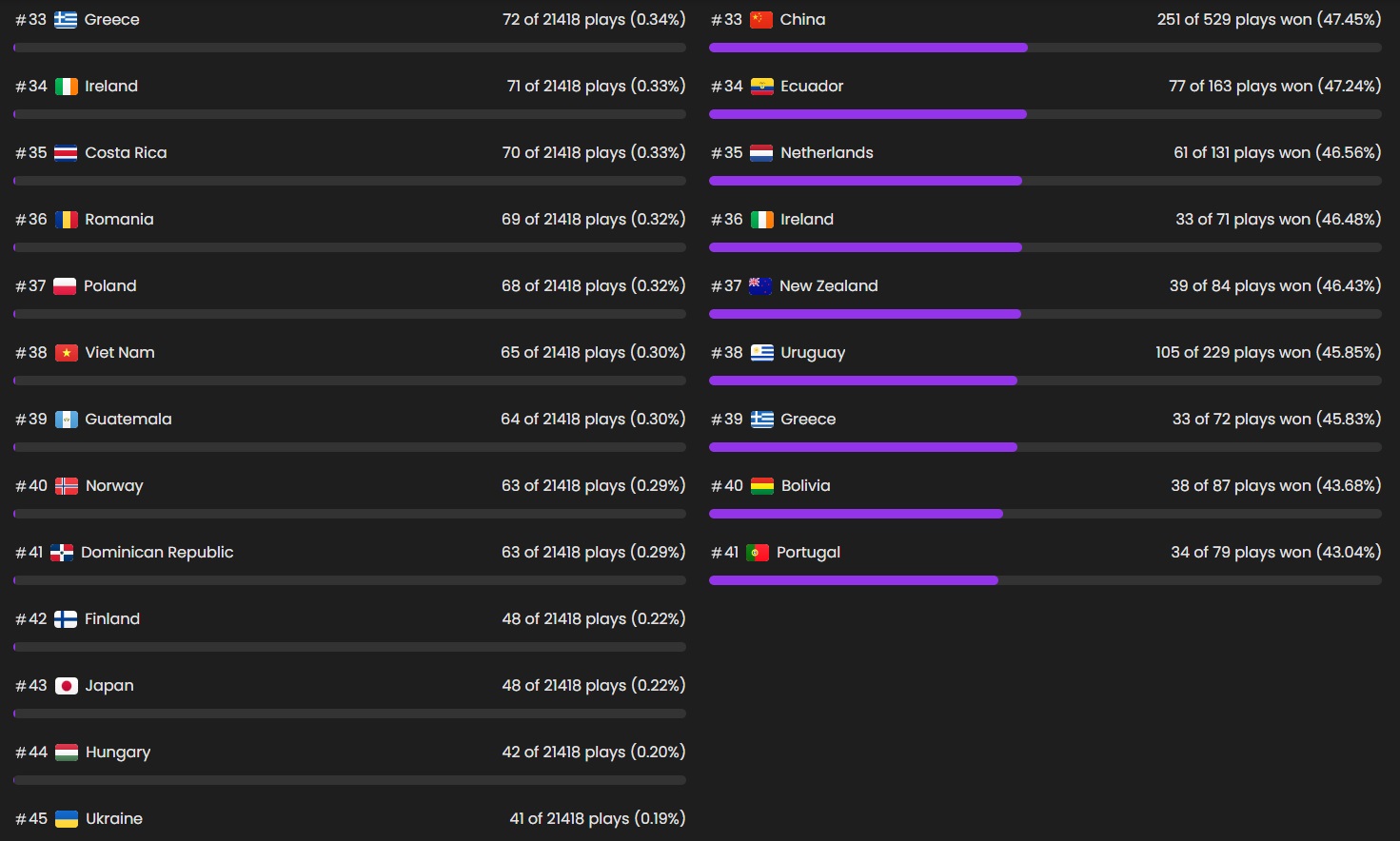 This is 2 places above Vietnam, that the devs said they added because of the high number of Vietnamese players. Vietnam has a population of 100.000.000 people and Romania of 20.000.000 players, so there are 5 times as many Vietnamese in the world yet more Romanian players than Vietnamese.