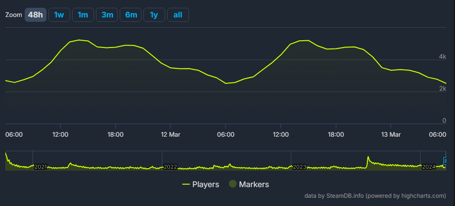 the most active part of the day is European evenings, around 1400 to 1600 CET, and after 2200 CET it drops off drastically. this suggest the player-base is majority European, as 1600 CET is like 10 in the Americas.