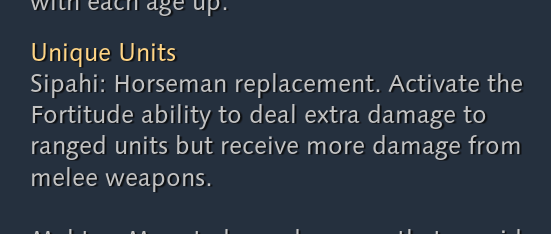 Tech Tree description states that Fortitude grants 50% more damage vs ranged units, while in game when selecting the Sipahi and hovering over the ability it says it grants +50% attack speed.