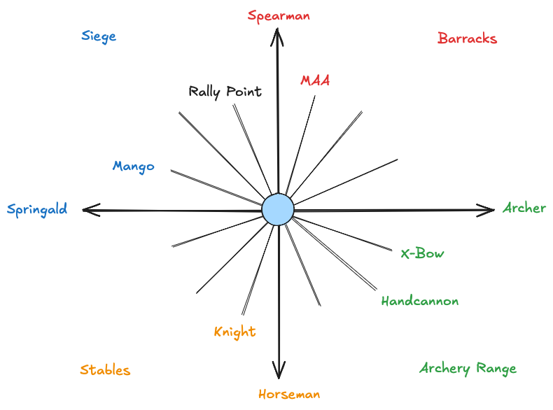 If we break the radial into 4 quadrants for the 4 primary production buildings, each building then has 4 “positions” that can be used (except the last one). Spear/Archer/Horseman are going to be on the primary axis. But, what I need community help/input on is what goes into the tertiary and quartenary slots? There are lots of civ specific unique units that might fit into these categories, and I haven’t taken the time to note them all down - but to me this is the level of rigor that I think this radial menu needs. And the positions need to be static of course.