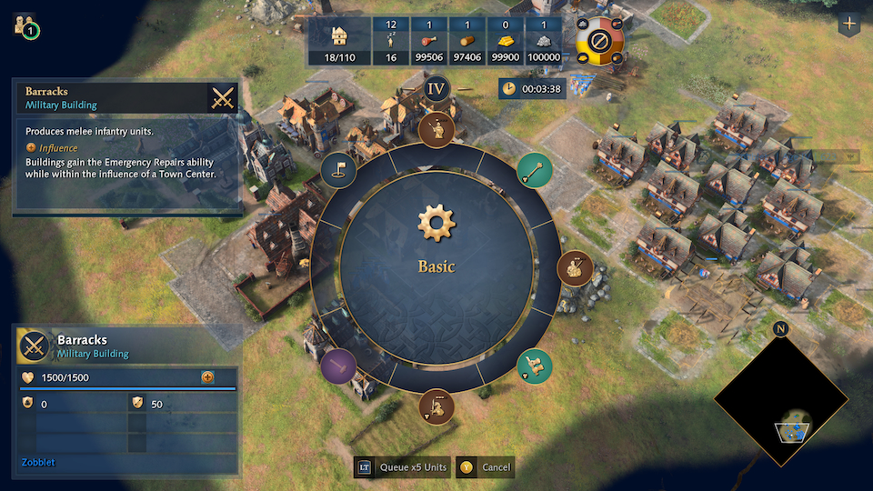 One might argue that since the Barracks only has one technology why put it in its own dedicated tab, and the reason is the “Quick Find Menu” or LB on the XBox. This menu, specifically LB + D-Pad Up (Military Production Buildings) is one of the fastest mid to late game methods for building military units because the game “remembers” that you are in this sub menu i.e. you press LB + D-Pad Up and next time you press LB you automatically see all your Military Production Buildings.
