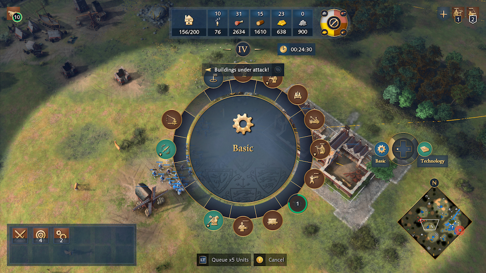 You get the point. So that addresses one problem with the Military Production Building radial menu. Next we get to the issue of standards. Back to my topic of speed or APM on the controller. The only way to improve this over time is by building muscle memory, so you intuitively know that 3 o’clock on the Economy Buildings production menu is a mining camp and 4 o’clock is a Mill (note: these are annoyingly swapped with only the French civ). On the Military Production Building Radial Quick Find Menu (LB + D-Pad Up) there is no order, and it changes if units are upgraded. Here is a screenshot with House of Lancaster where upon upgrading to Elite the Yeoman swap places with the Springald.